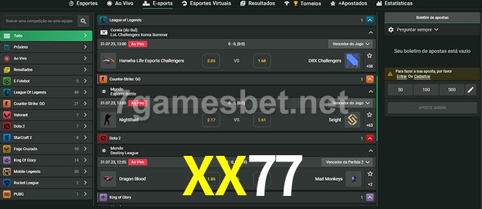 O XX77 oferece uma grande seleção de opções de apostas em e-sports com probabilidades competitivas